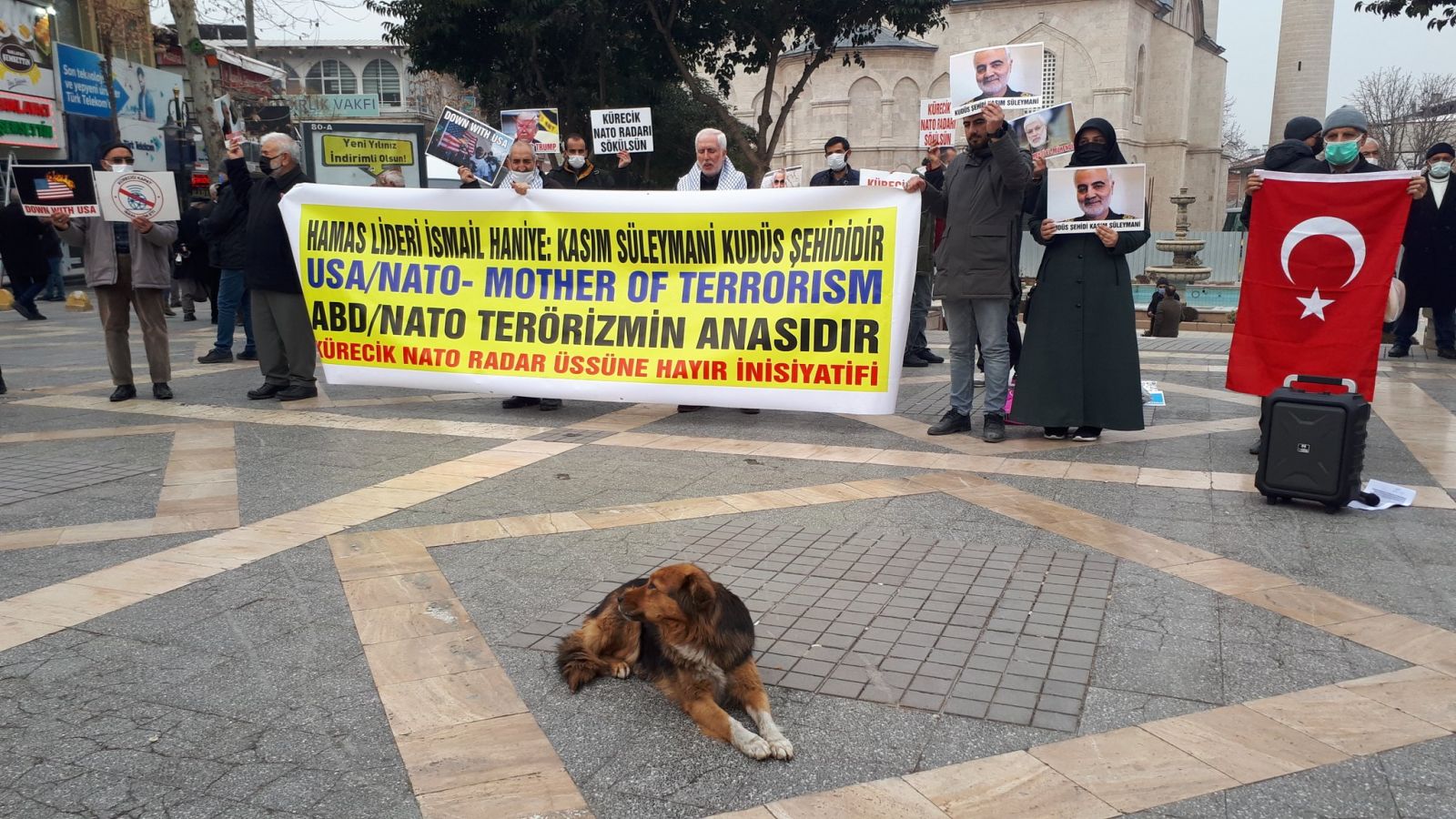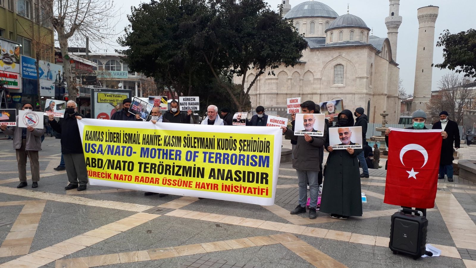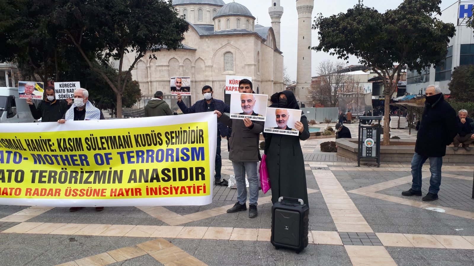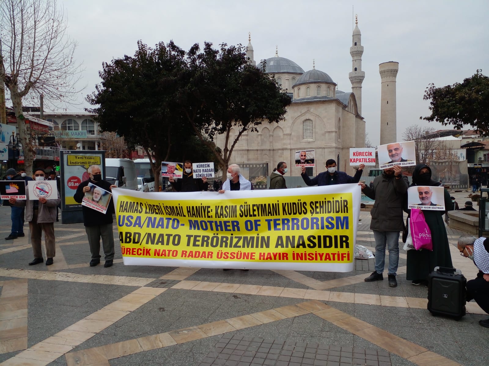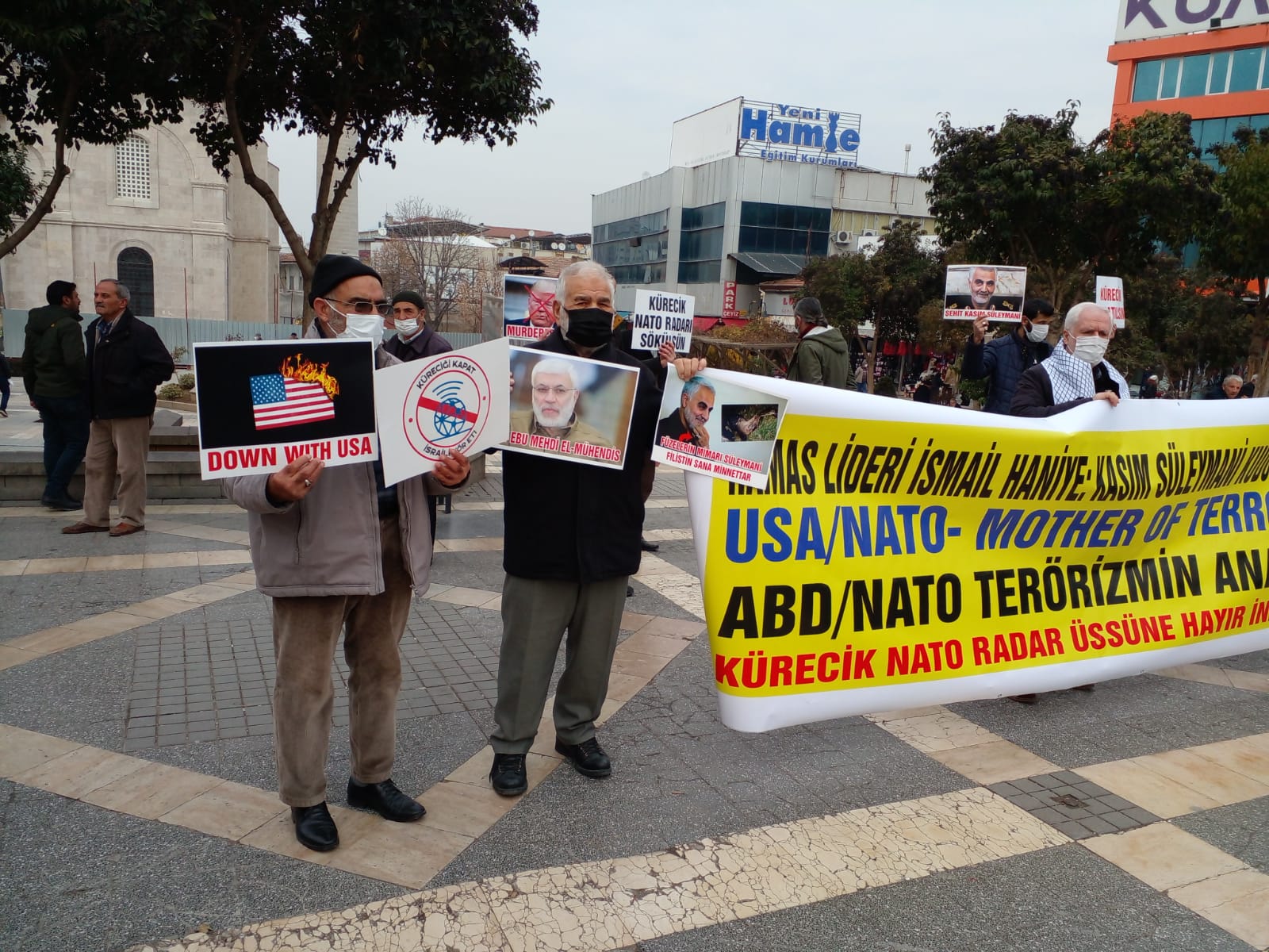 Kahrolsun NATO Kahrolsun Amerika, Kahrolsun İsrail, NATO'dan Çıkılsın Üsler Kapatılsın, Kürecik İncirlik Kapatılsın, Katil NATO Türkiye'den Defol, Katil Trump Hesap Verecek, Şehitlerin Yolunu Sürdüreceğiz, Hepimiz Kasım Süleymani'yiz, Kudüs Şehidi Süleymani, Biz Biriz Ümmetiz Kardeşiz, Direniş Cephesi Onurumuzdur, Kudüs Yolunda Hepimiz Kasım Süleymani'yiz ve Direne Direne Özgür Kudüs'e sloganlarının atıldığı eylemde basın açıklamasını Mavi Marmara gazisi Mehmet Tunç okudu.