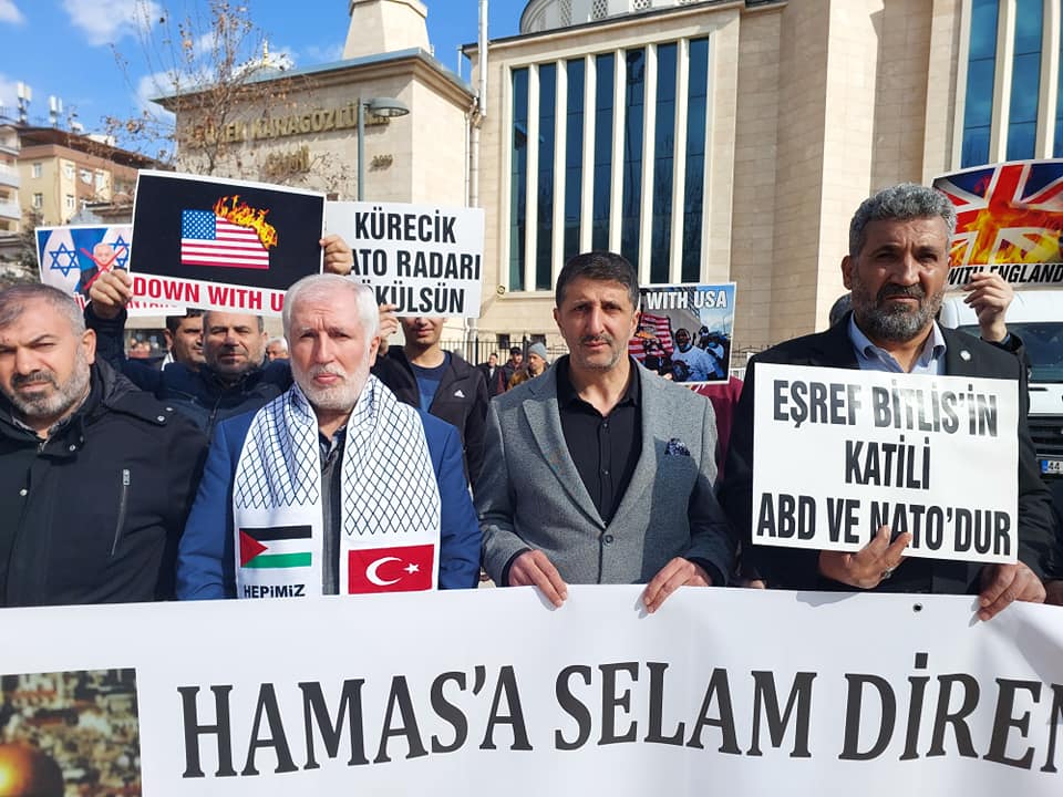 Eylemde ‘Kahrolsun İsrail Kahrolsun ABD’, ‘Kürecik İncirlik Kapatılsın’, ‘Nato’dan Çıkılsın Üsler Kapatılsın’, ‘Laf Değil İcraat Küreciği Söküp At’, ‘Katil NATO Türkiye’den Defol’, ‘Siyonist Devlet Yıkılacak Elbet’, ‘Hamas’a Selam Direnişe Devam’, ‘Şehitlerin Yolunu Sürdüreceğiz’, ‘Avrupa Değil İslam Birliği’, ‘Hepimiz Necmeddin Erbakan’ız’, ‘Adil Düzen Tam Bağımsız Türkiye’, ‘Direniş Cephesi Ümmetin İftiharı’, ‘Nato’ya Karşı Hepimiz Eşref Bitlis’iz’, ‘ABD’ye Karşı Hepimiz Eşref Bitlis’iz’, ‘Kahrolsun NATO Kahrolsun Amerika’, ‘Lebbeyk Lebbeyk Lebbeyke Ya Aksa’, ‘Hizbullah’a Hamas’a Direnişe Bin Selam’, ‘Hayfa’ya Değil Gazze’ye Gemi Gönderin’, ‘İsraille Ticaret Filistin’e İhanet’ ve ‘Anlaşma İhanet Filistin Emanet’ sloganları atıldı.
