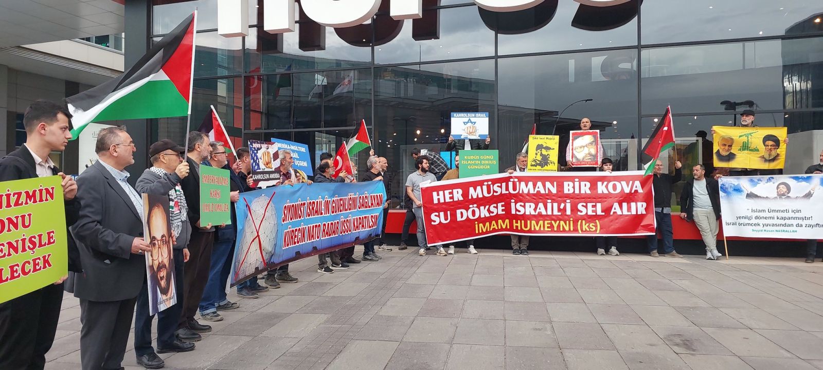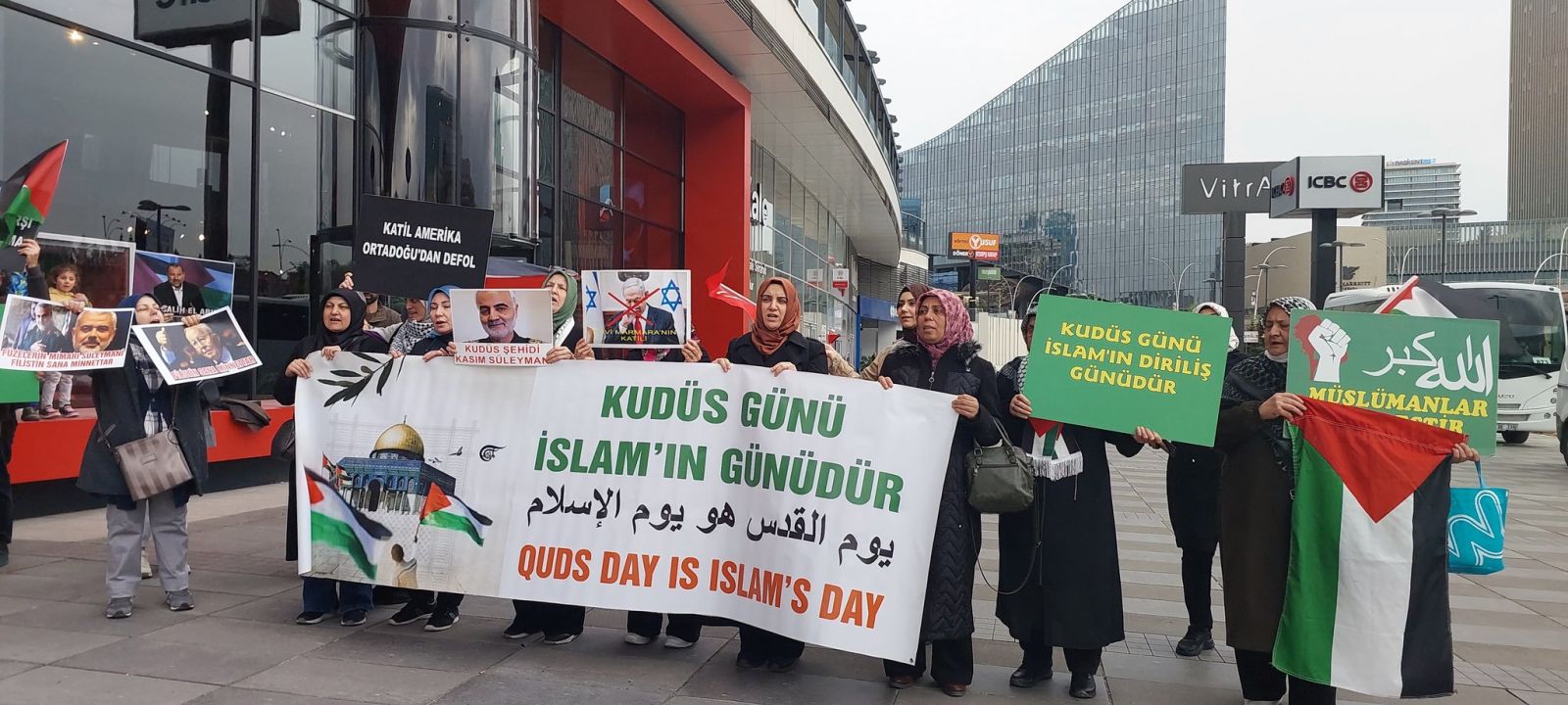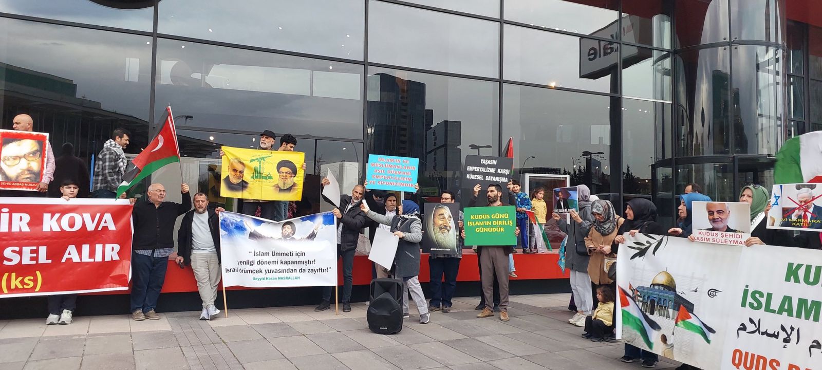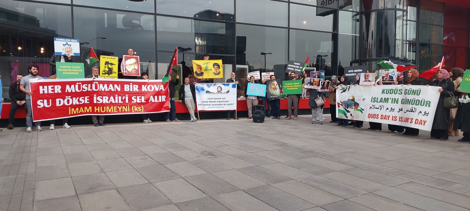Kudüs şehitlerinin fotoğraflarının taşındığı eylemde katılımcılar Kudüs Günü İslam’ın Günü, Kahrolsun İsrail Kahrolsun Amerika, Katil Trump Hesap Verecek, Refah Kapısı Açılsın, Yaşasın Küresel İntifada, Gazze’ye Selam Direnişe Devam, Hizbullah’a Hamas’a Direnişe Bin Selam, İşbirlikçi Rejimler Hesap Verecek, Nato’dan Çıkılsın Üsler Kapatılsın ve Siyonist Elçilik Kapatılsın sloganlarını attı.