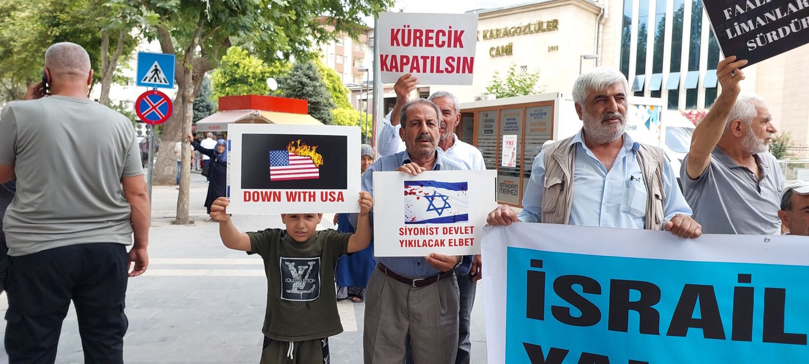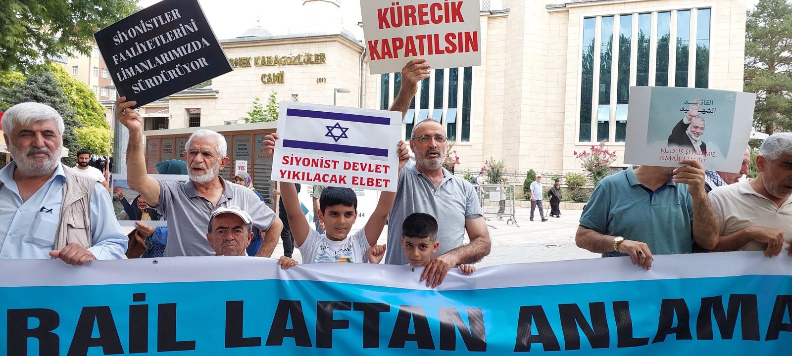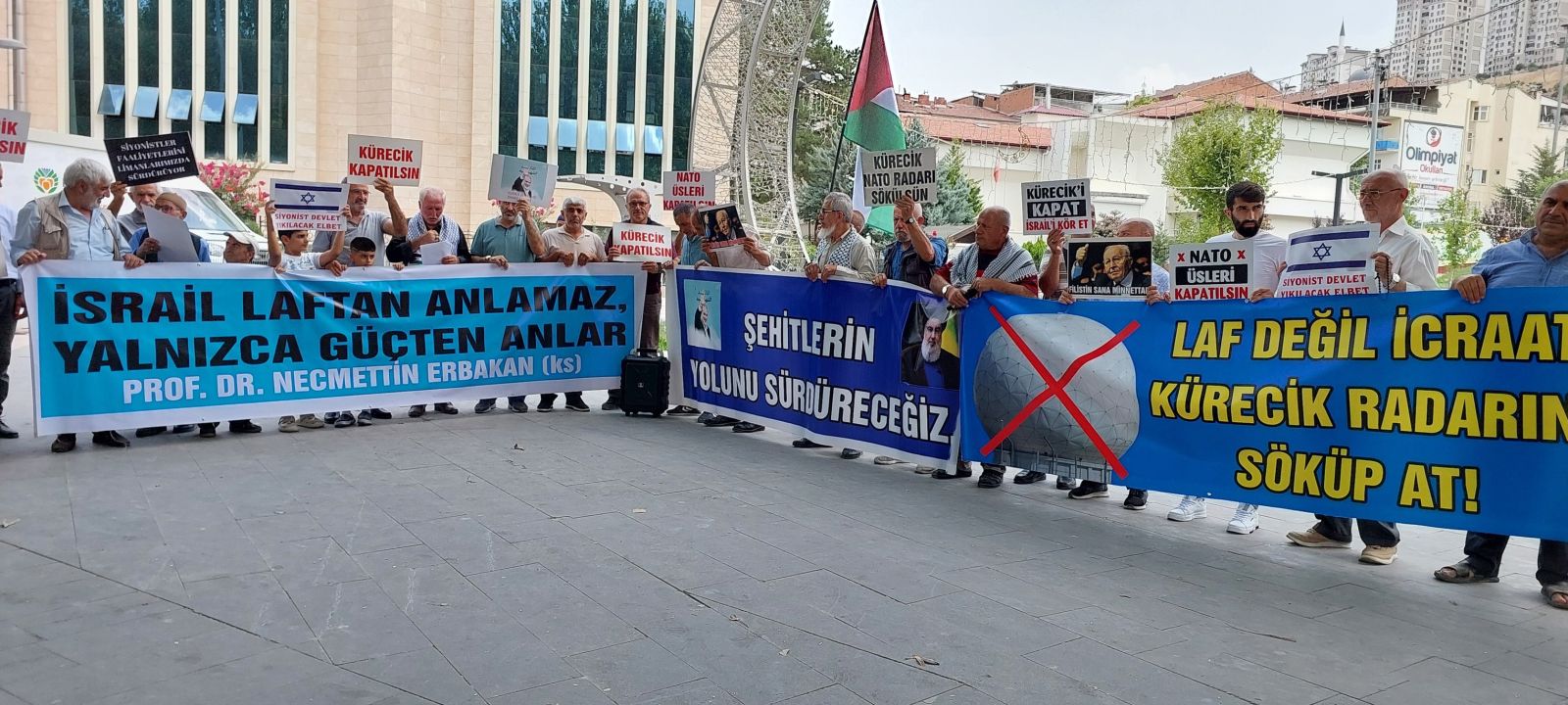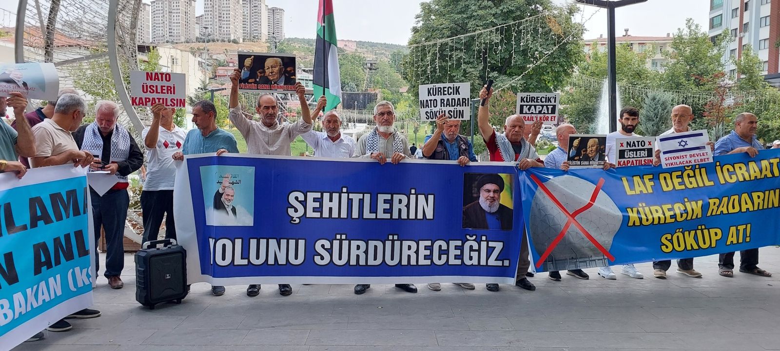 Eylemde katılımcılar; ‘Kahrolsun ABD Kahrolsun İsrail’, ‘Bakü Ceyhan Hattından Akan Petrol Değil Kan’, ‘Kürecik Radarı Kapatılsın’, ‘Laf Değil İcraat Küreciği Söküp At’, 'İsmail Heniyye Yolun Yolumuz', 'Gazze'ye Selam Direnişe Devam' ve ‘Hizbullah’a Hamas’a Direnişe Bin Selam’ sloganlarını attı.