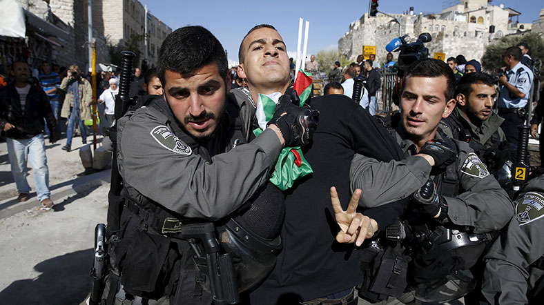 İsrail askerleri yürüyüşe katılan onlarca Filistinliyi gözaltına aldı. [Fotoğraf-Reuters]