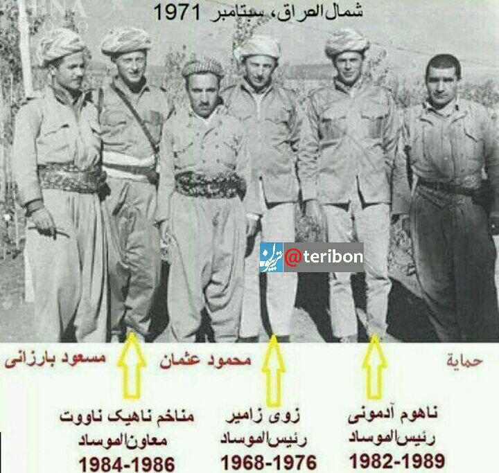 2. Fotoğraf 1971 Eylül'ünde Kuzey Irak'ta Çekilmiş soldan sağa: MESUT BARZANİ, MOSSAD Başkan Yardımcısı Menahim Nahik Navet, Mahmud Osman, MOSSAD Başkanı Zevi Zamir, 1982-89 Yılları arasında MOSSAD Başkanlığı Yapan Nahom Admoni.