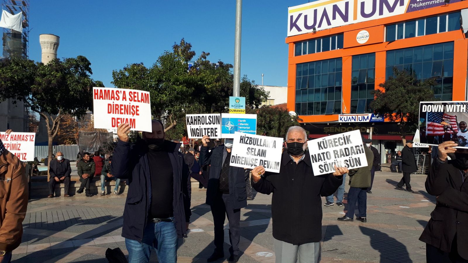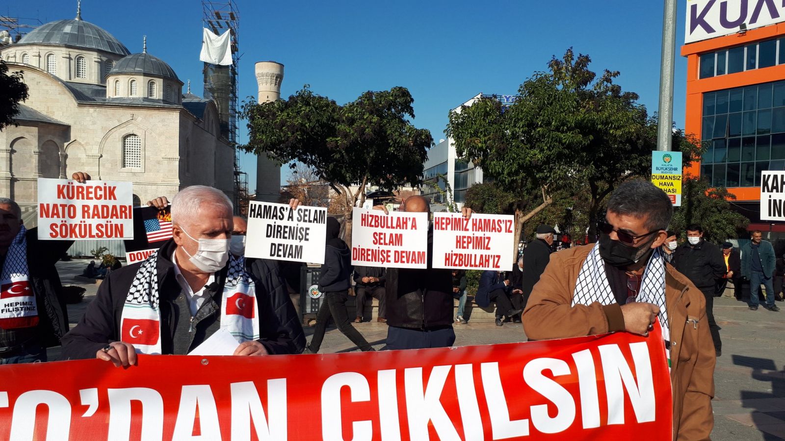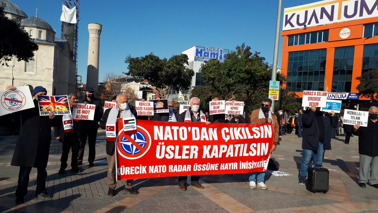 Kahrolsun NATO Kahrolsun Amerika, Kahrolsun İngiliz Emperyalizmi, NATO'dan Çıkılsın Üsler Kapatılsın, Kürecik İncirlik Kapatılsın, Katil NATO Türkiye'den Defol, Hizbullah'a Hamas'a Direnişe Bin Selam, Hepimiz Hamas'ız Hepimiz Hizbullah'ız, Siyonist Devlet Yıkılacak Elbet ve Direne Direne Özgür Kudüs'e sloganlarının atıldığı eylemde basın açıklamasını Mavi Marmara gazisi Mehmet Tunç okudu.
