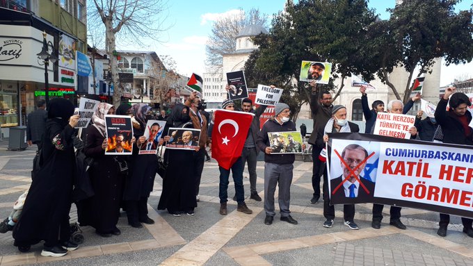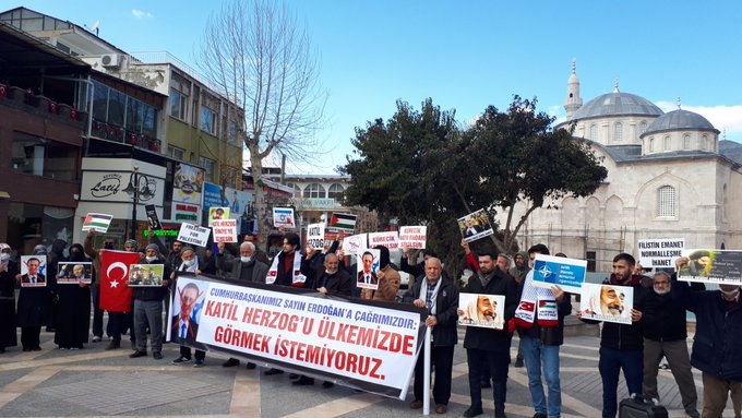 Başta rahmetli Necmettin Erbakan, şehit Şeyh Ahmed Yasin, şehit Abbas Musavi, şehit İmad Muğniye, şehit Fethi Şikaki, İsmail Heniyye ve Mavi Marmara şehitleri olmak üzere Hamas, İslami Cihad ve Hizbullah şehitlerinin ve liderlerinin fotoğraflarını taşıyan topluluk basın açıklaması sırasında 'Katil Herzog'u İstemiyoruz', 'Kahrolsun İsrail Kahrolsun Amerika', 'Filistin'e İhanet Affedilemez', ‘Filistin Emanet Anlaşma İhanet’, 'Siyonist Elçilik Kapatılsın', 'Siyonist Devlet Yıkılacak Elbet', 'İsrail'le Anlaşma Büyük Vebaldir', 'İsrail'le Anlaşma Büyük Zillettir', 'Terörist İsrail Türkiye'den Defol, 'İslam Ümmeti Kabul Etmez Zilleti', 'Özgür Kudüs İsrailsiz Dünya', 'Kürecik İncirlik Kapatılsın', 'Mescidi Aksa Onurumuzdur', 'Malatya’dan Kudüs'e Direnişe Bin Selam', ‘Hizbullah’a Hamas’a Direnişe Bin Selam’, ‘NATO’dan Çıkılsın Üsler kapatılsın’ ve 'Müslüman Uyuma İlk Kıblene Sahip Çık' sloganlarını attı.