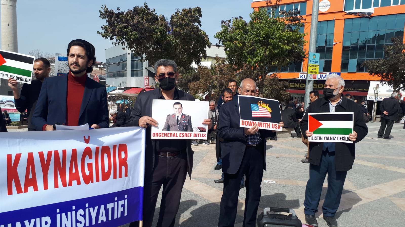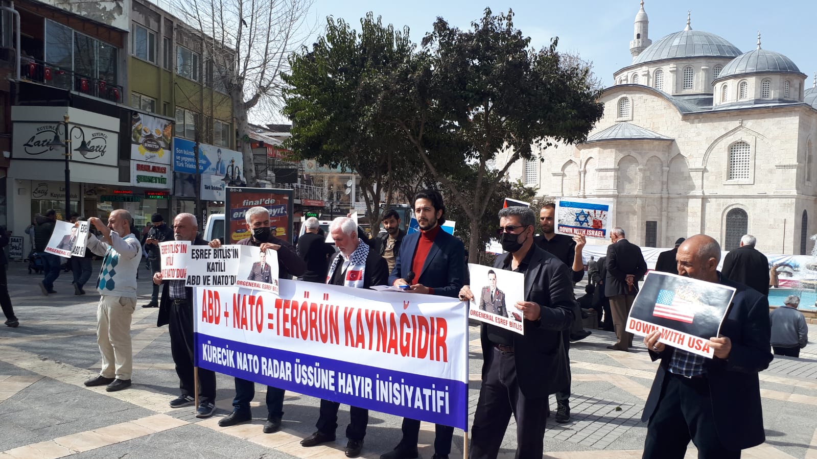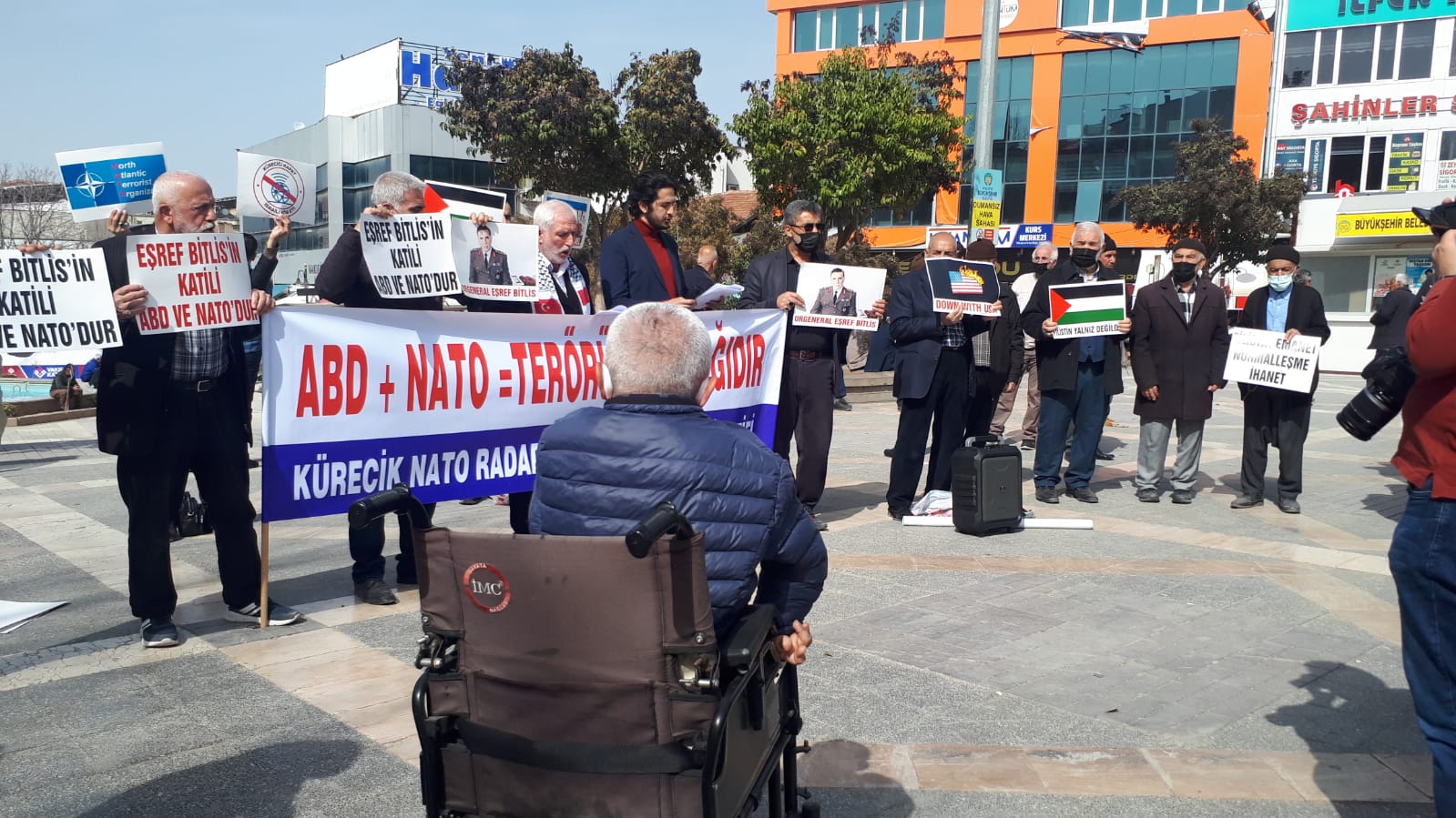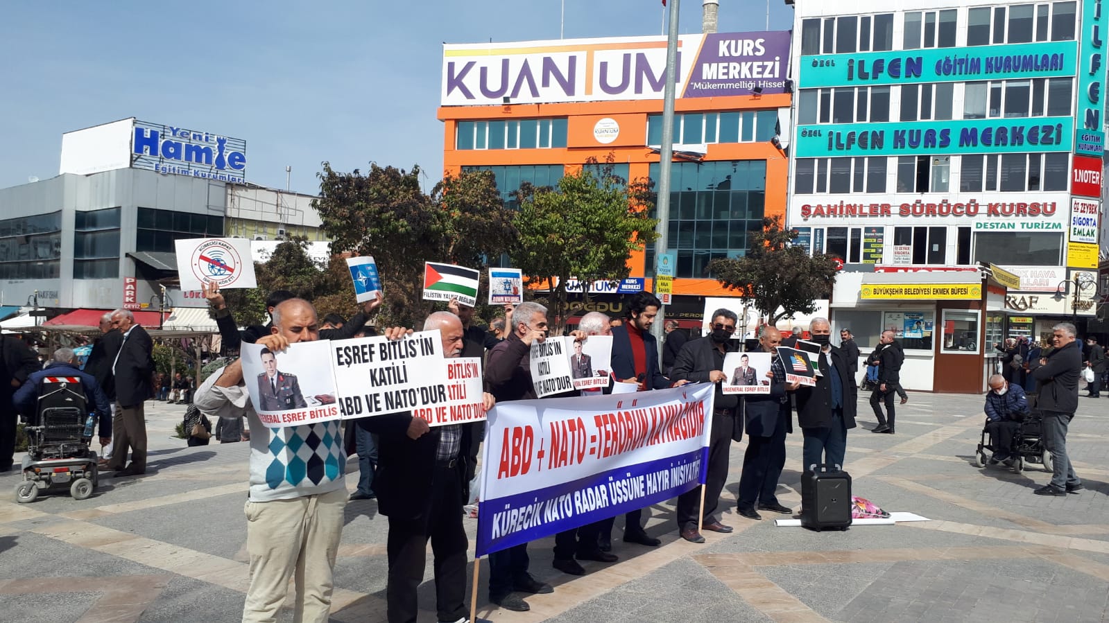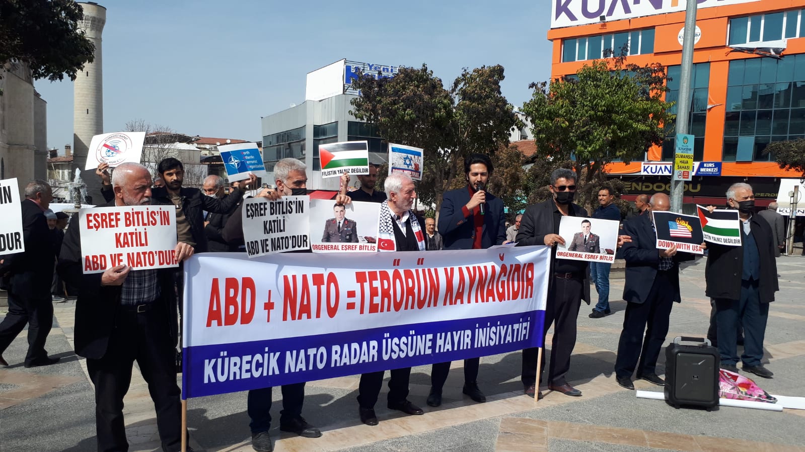 NATO'ya Karşı Hepimiz Eşref Bitlis'iz', 'Terörist NATO Türkiye'den Defol', 'Kahrolsun NATO Kahrolsun Amerika', 'ABD'ye Karşı Hepimiz Eşref Bitlis'iz', 'NATO'dan Çıkılsın Üsler Kapatılsın', 'Kürecik-İncirlik Kapatılsın', 'Katil NATO Türkiye'den Defol', 'Kahrolsun İsrail Kahrolsun Amerika', 'Filistin Emanet Anlaşma İhanet' ve 'Hamas'a Selam Direnişe Devam' sloganlarının atıldığı ve ABD+NATO= TERÖRÜN KAYNAĞIDIR pankartının açıldığı eylemde sunuculuğu Muhsin Telek yaptı.