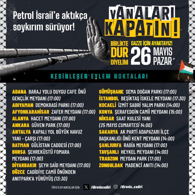 İSLAM ÜLKELERİ, 25 Mayıs 2024 15:29Petrol İsrail'e aktıkça soykırım sürüyor! Gazze'de katliam devam ederken siyonistlere Kazakistan ve Azerbaycan petrolünü Türkiye taşıyor. Hep birlikte "vanaları kapatın! işgal bitene dek sevkiyat dursun!" demek için 26 Mayıs Pazar ayaktayız! Güncel eylem noktaları için Direniş Çadırı'nın X hesabını takip ediniz.